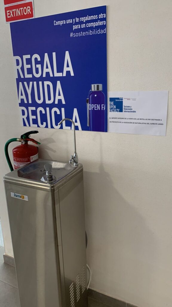 Allá Facultad de Turismo de la Universidad de Murcia puso en marcha la venta de botellas metálicas reutilizables, para incentivar el consumo de agua del grifo en Murcia, y evitar así los importantes costes medioambientales del agua embotellada, como el aumento de los plásticos que acaban extendiéndose, principalmente, a través de los ecosistemas acuáticos, provocando el. muerte de muchas faunas asociadas a ellos.