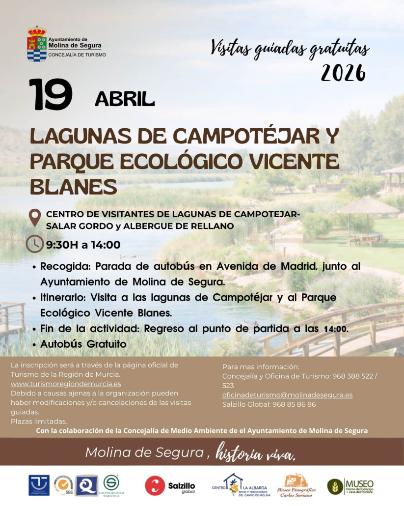 La Concejalía de Turismo del Ayuntamiento de Molina de Segura, en colaboración con el Ministerio de Medio Ambiente, el Instituto de Turismo de la Región de Murcia, la Red Regional de Oficinas de Turismo, y como parte del programa Tu visita guiada gratuitaorganizar la visita guiada gratuita ELLAGUNAS DE S CAMPOTÉJAR Y PARQUE ECOLÓGICO VICENTE BLANESque tendrá lugar el HACERmingo 19 desde hastabrlo harétiene 09.30 horas, desde la parada de Avenida de Madrid, al lado del Ayuntamiento. El regreso al casco urbano de Molina de Segura está previsto para las 14.00 horas.
