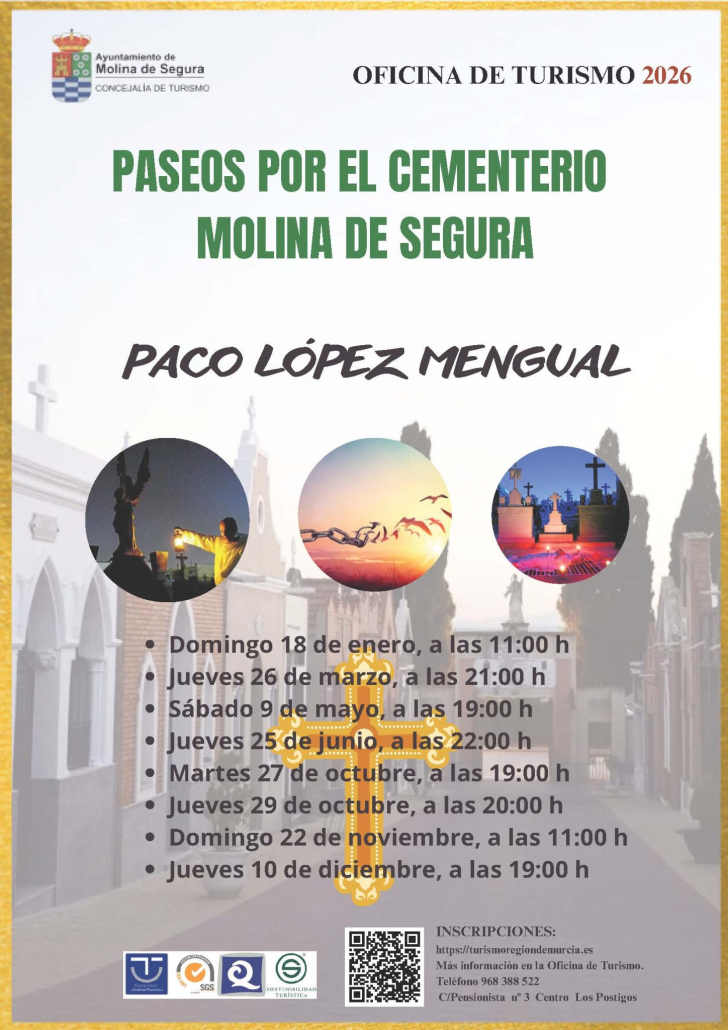 La Concejalía de Turismo del Ayuntamiento de Molina de Segura pone en marcha una nueva edición de Paseos en el cementerioPaseos culturales en el cementerio municipal, una iniciativa ya consolidada desde 2018, con la participación de más de 6.000 personas desde su creación, que ofrece a ciudadanos y visitantes una forma diferente, respetuosa y responsable de conocer la historia y el patrimonio local.
